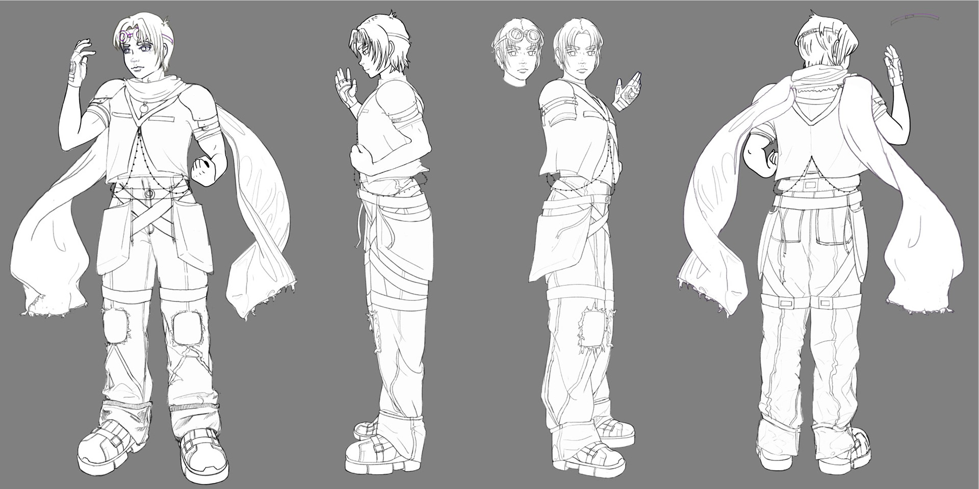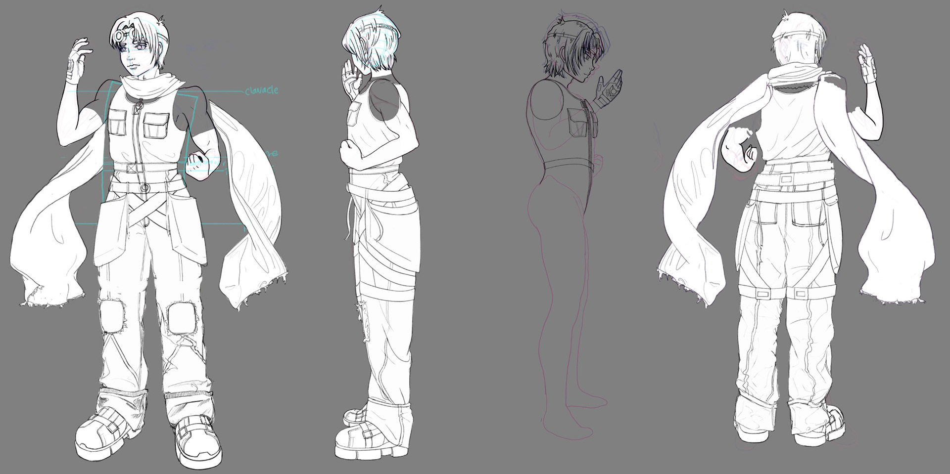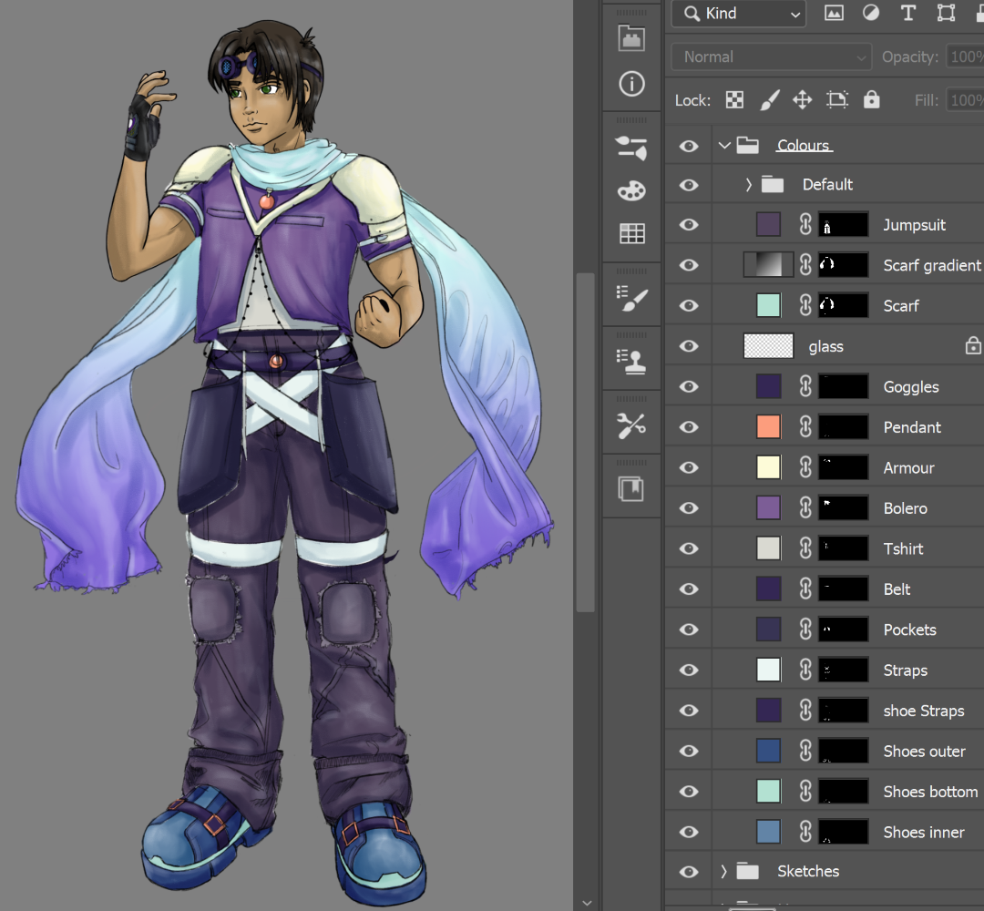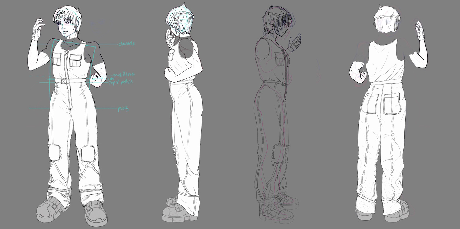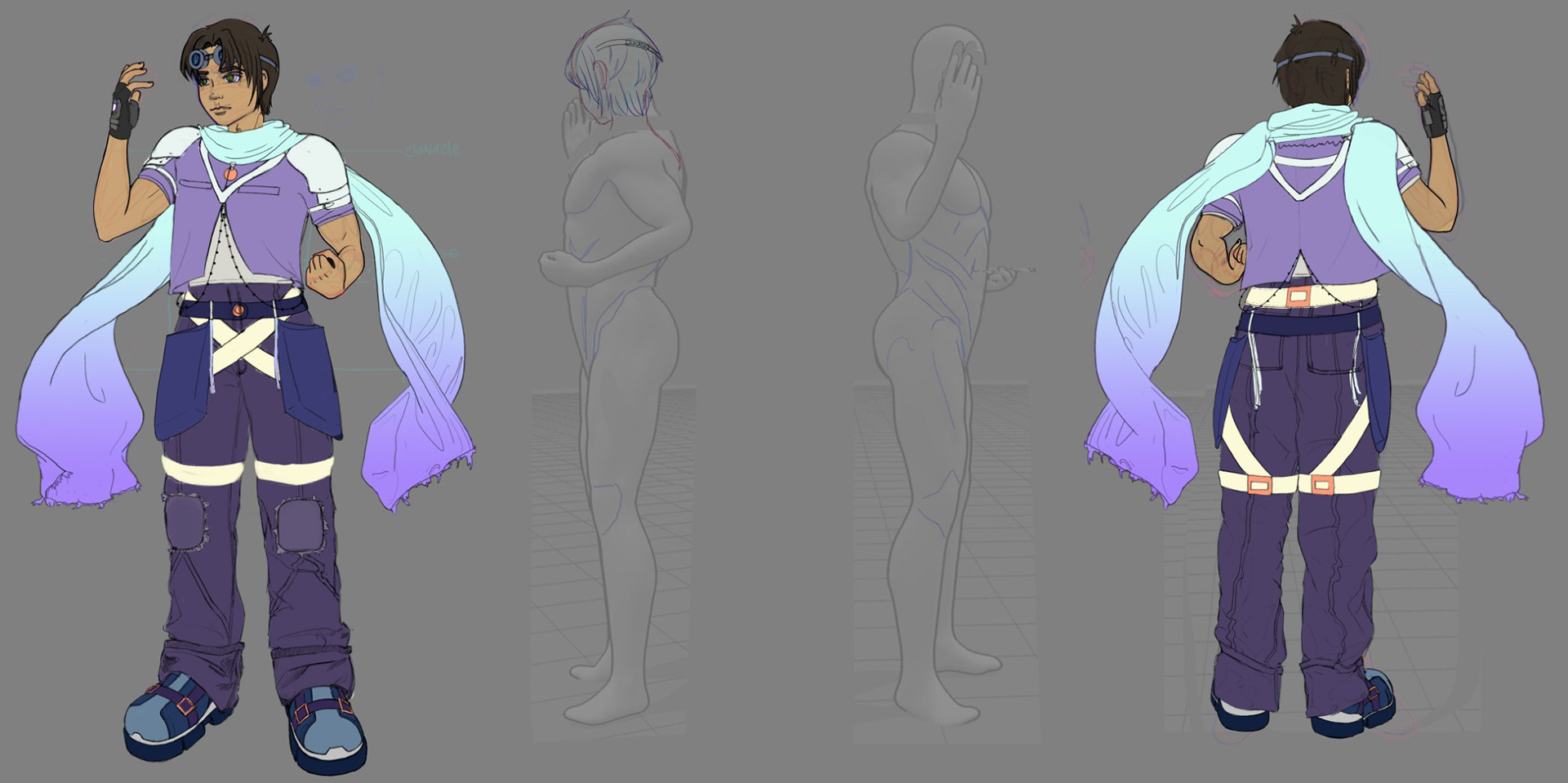 Below you will see the final 6-layer character turnaround, followed by my design process including fashion, pose, and colour ideation and client feedback implementation. Click on any image to expand.