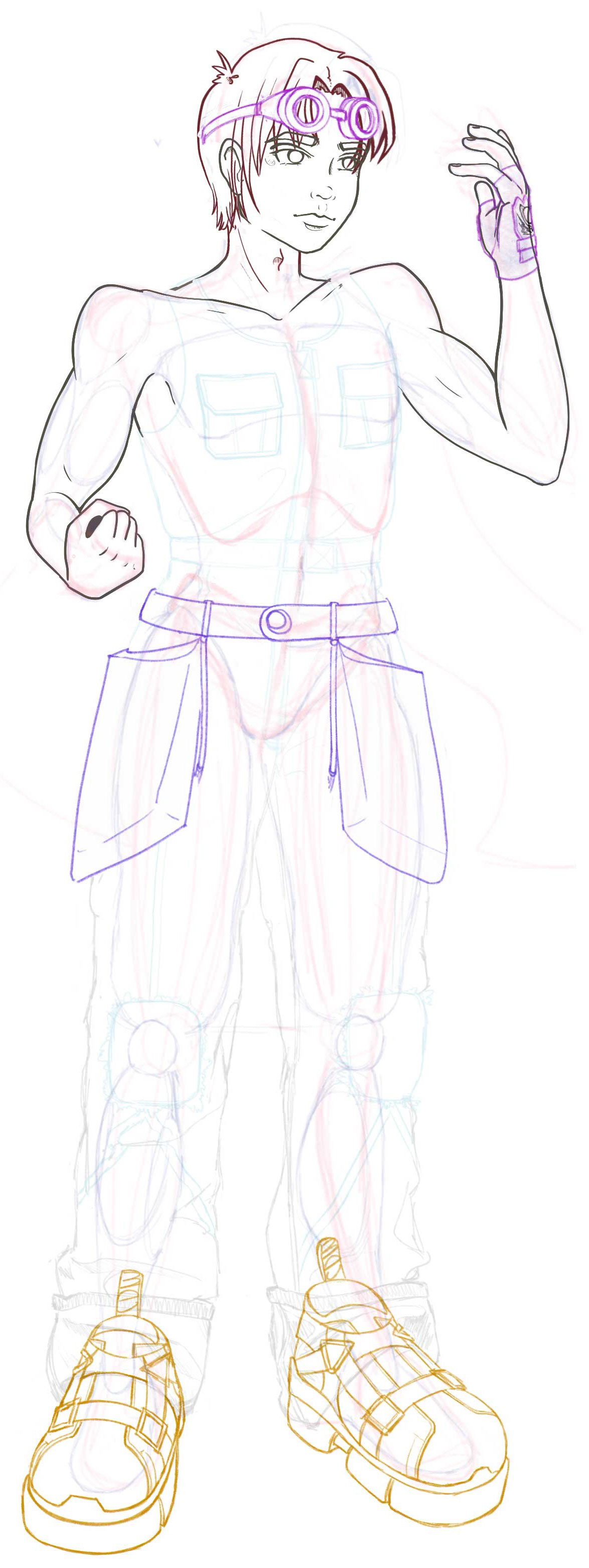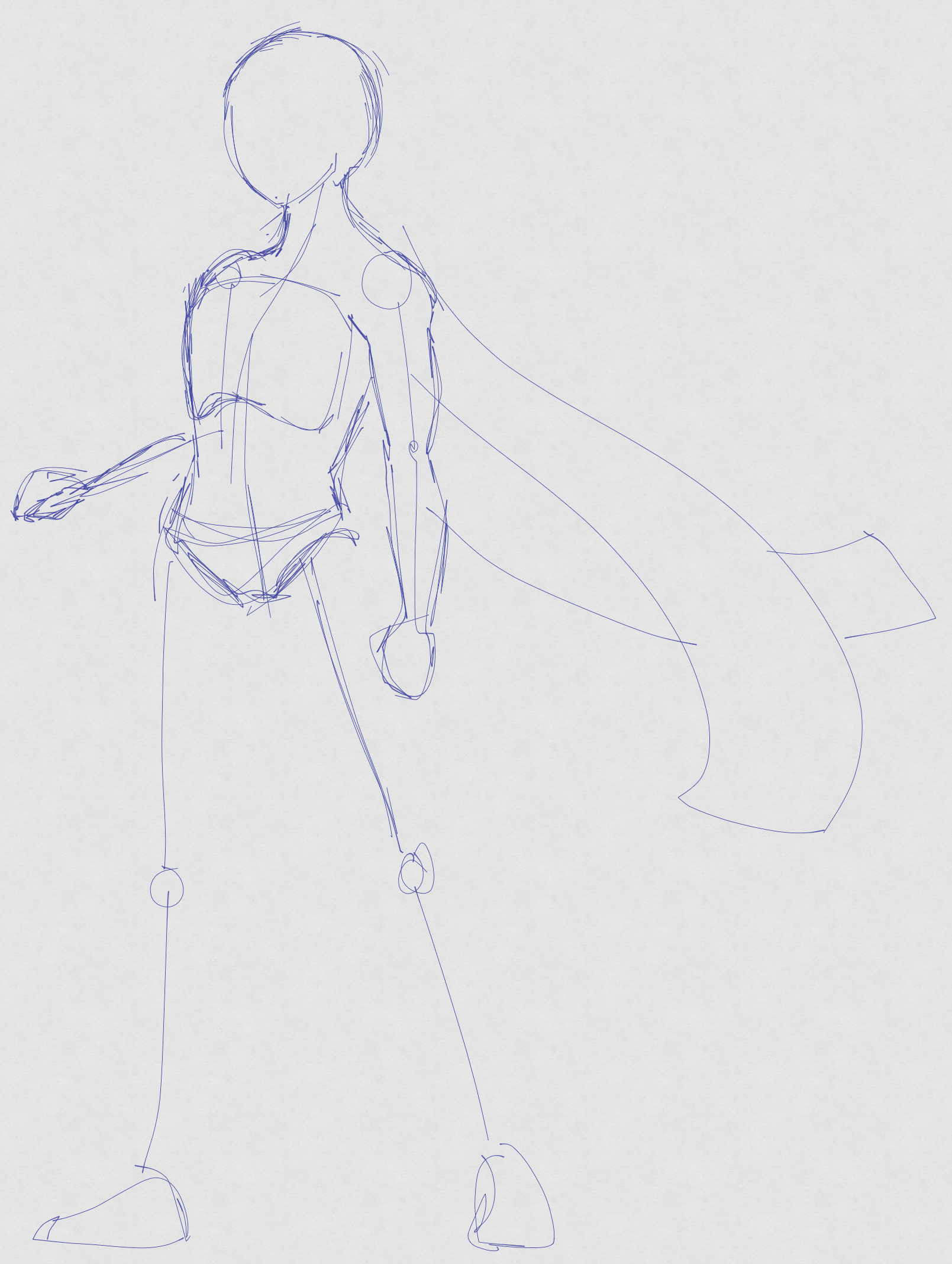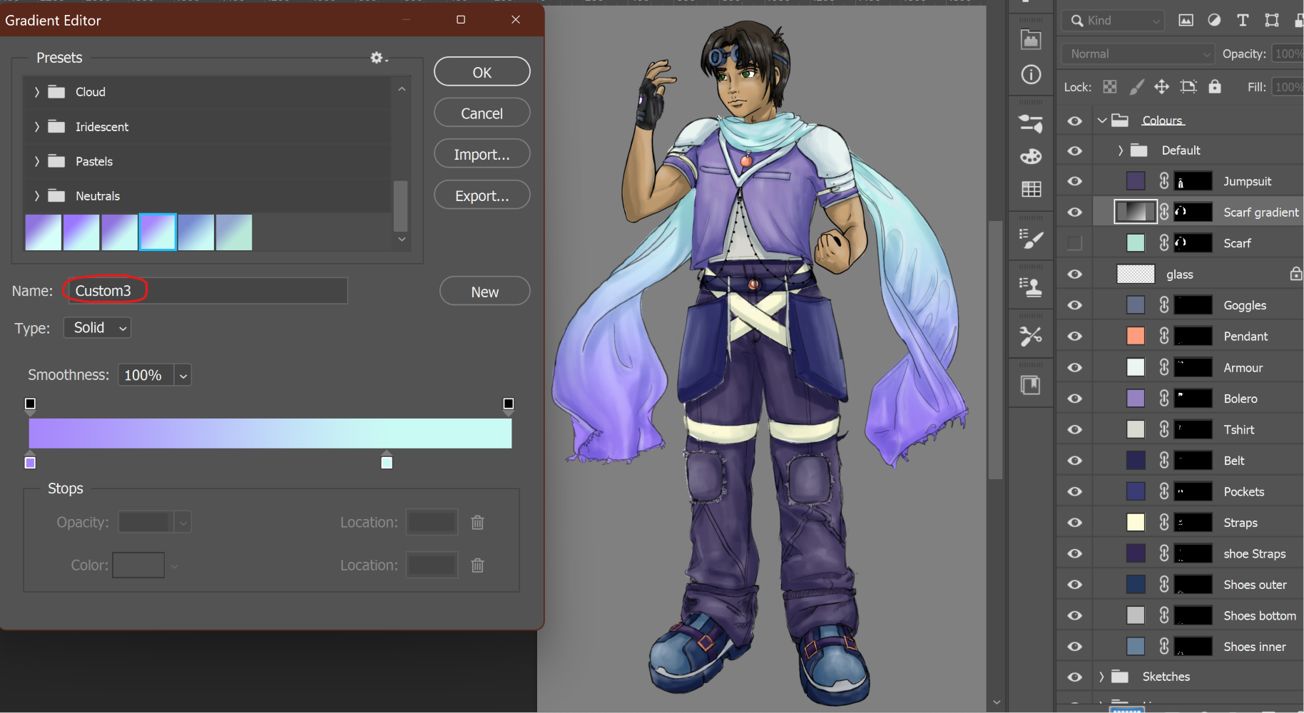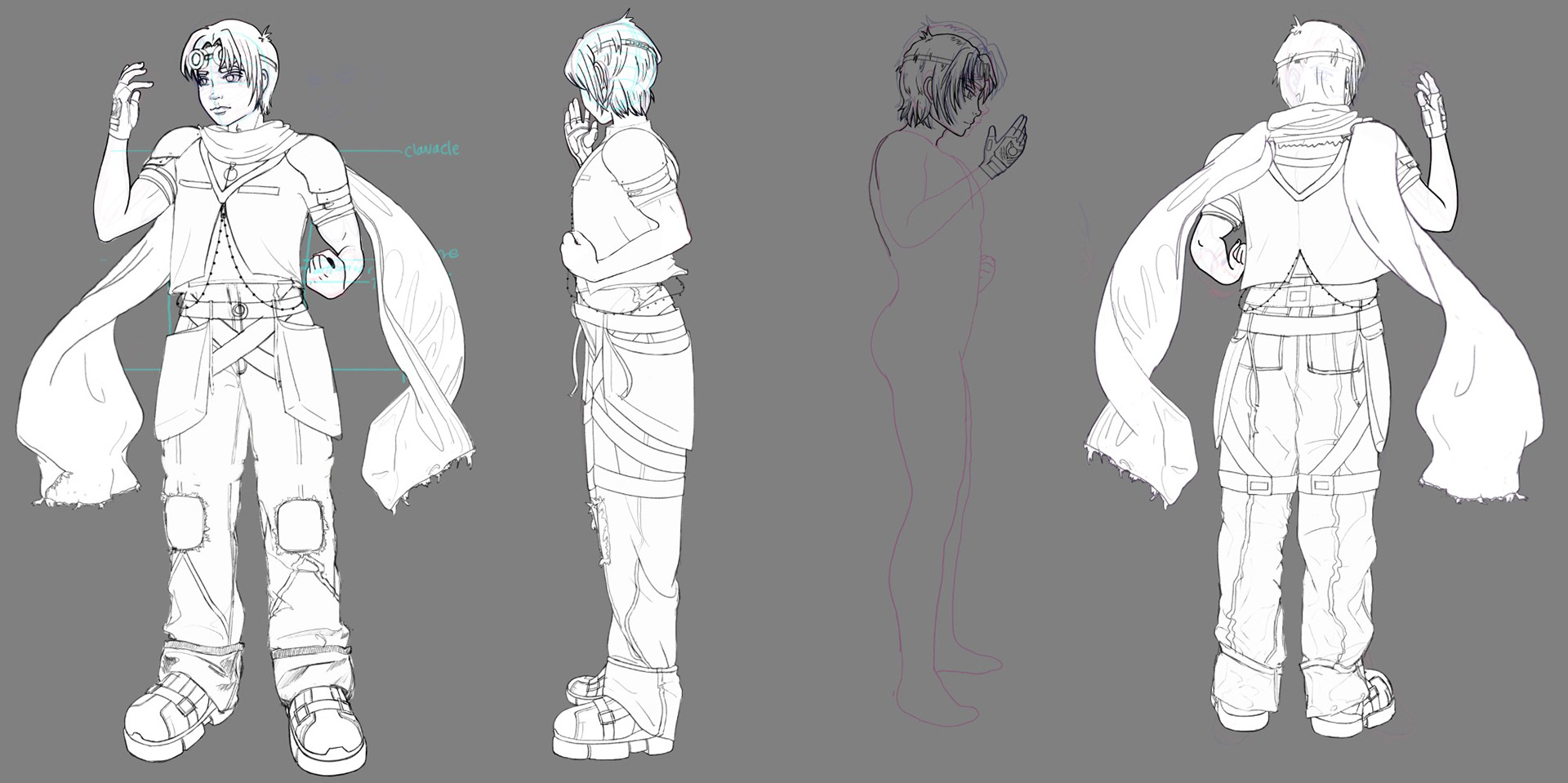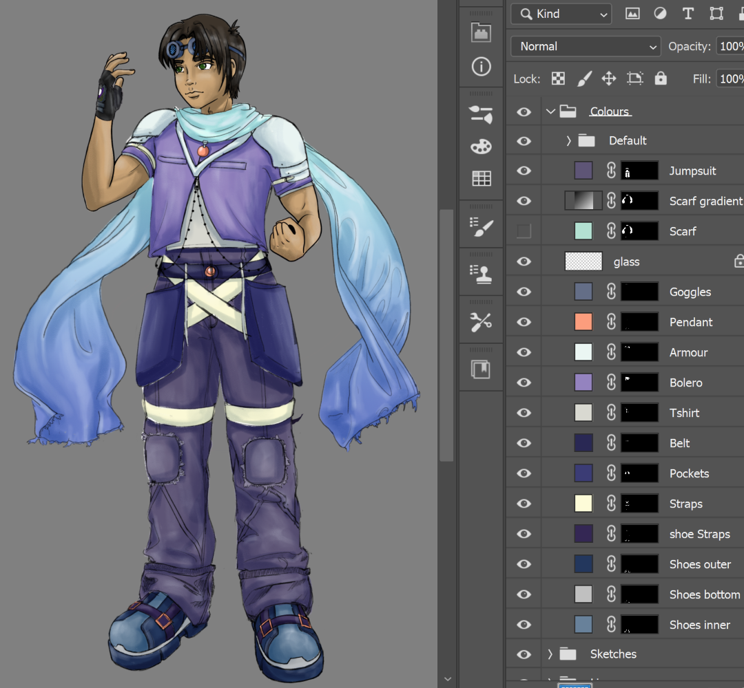 Below you will see the final 6-layer character turnaround, followed by my design process including fashion, pose, and colour ideation and client feedback implementation. Click on any image to expand.