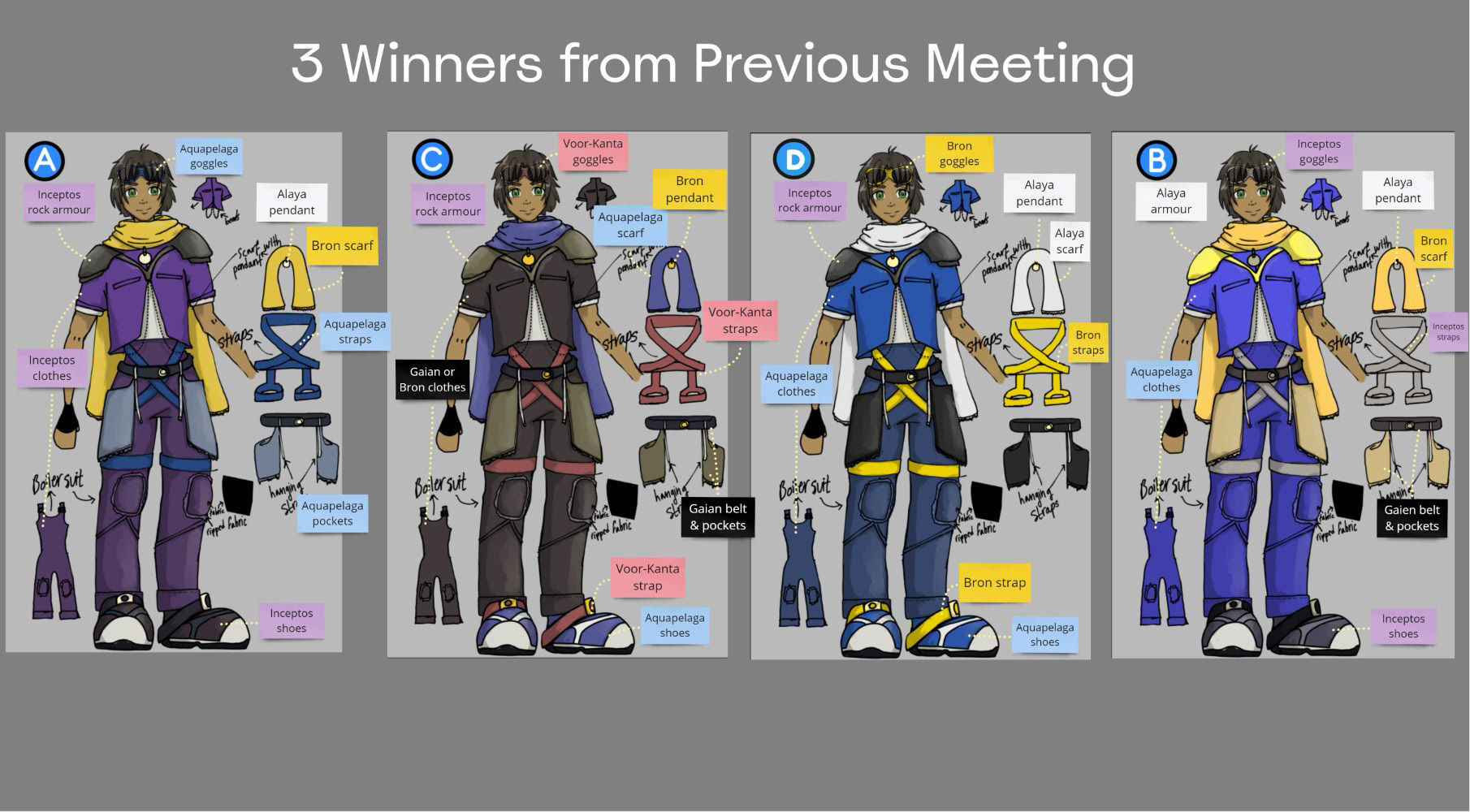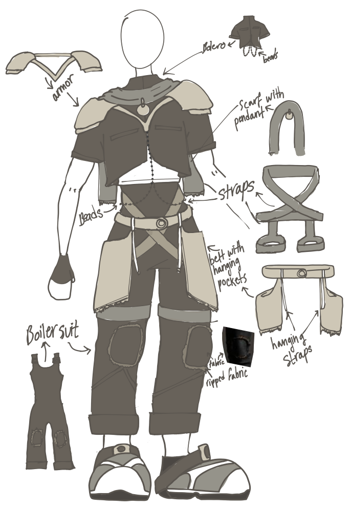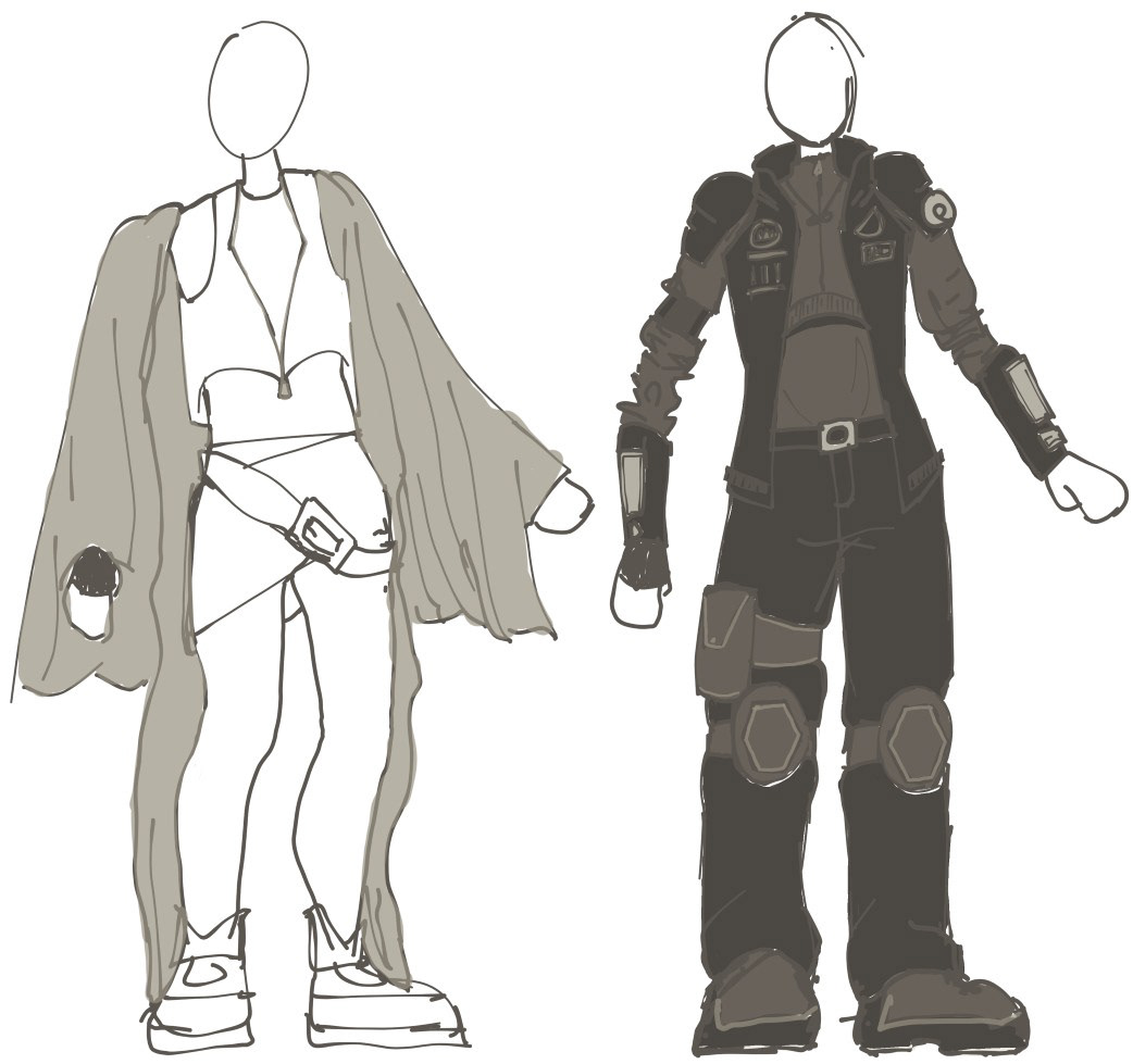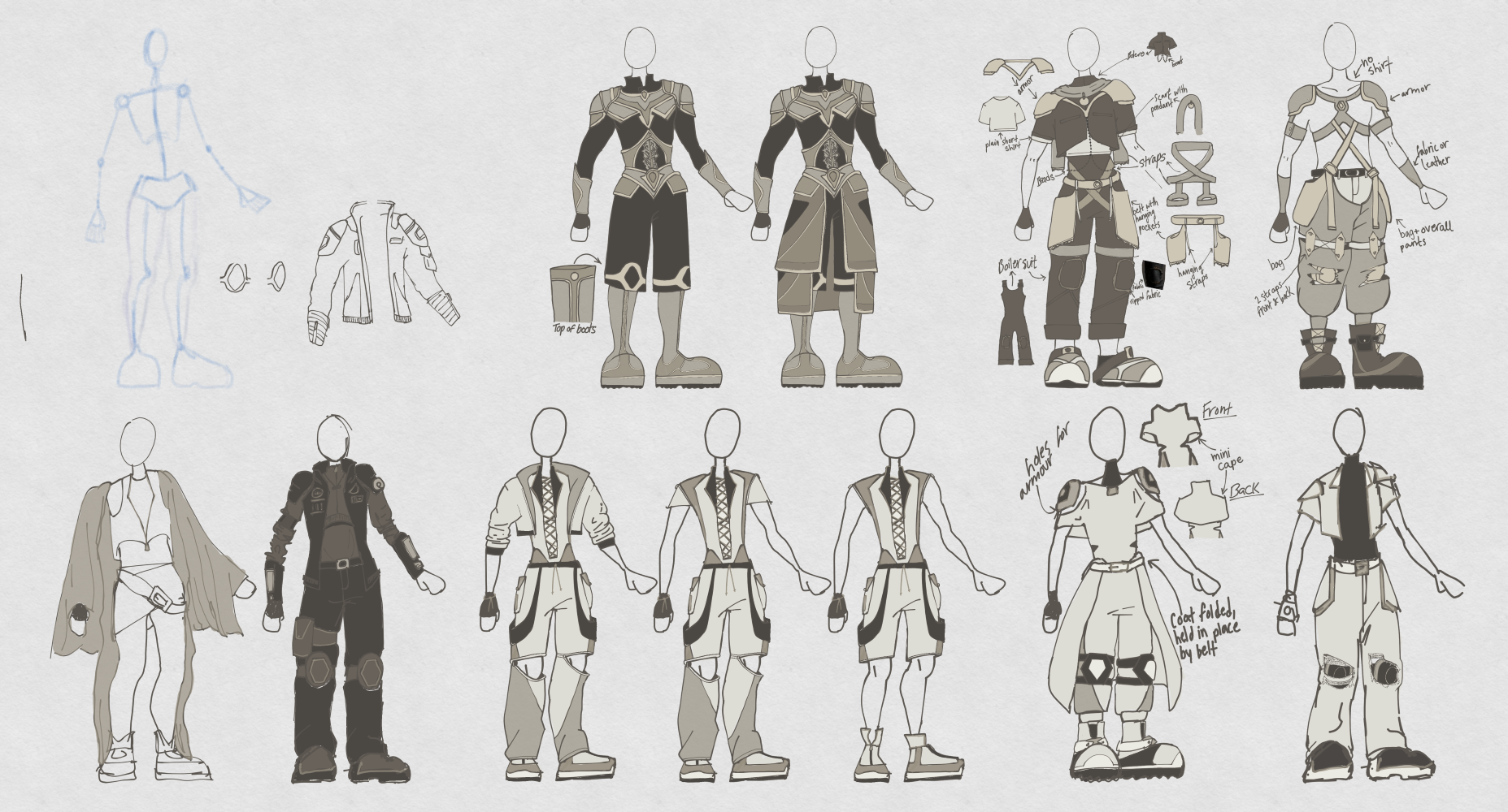 The first three designs on the above left were what came out of my initial design session, and the designs next to them are adjustments made according to client feedback, such as adding sleeves and knee details, big shoes, adding pants, removing leggings and shoe laces.