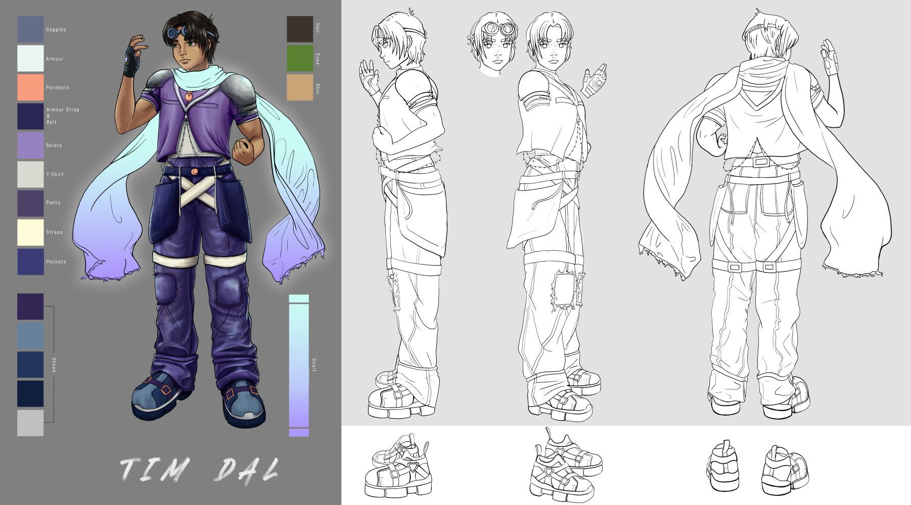 My role on this team was primarily as the Character Fashion Designer, tasked with designing a new outfit for the main character, Tim, to wear during the events of the game. The rest of the team consisted of a game designer, project manager, creature designer, and two developers.