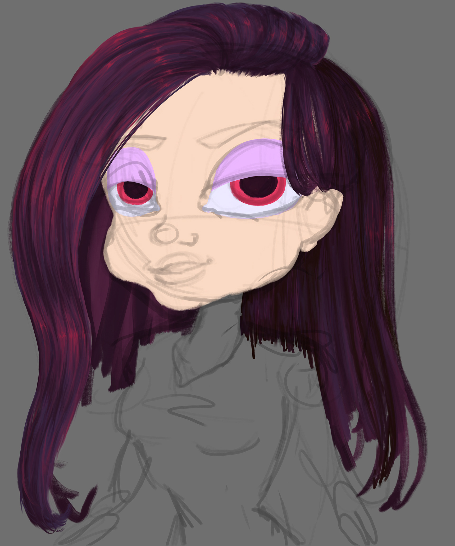 A work in progress of a smug looking woman drawn in an exaggerated cartoon style using Adobe Photoshop.